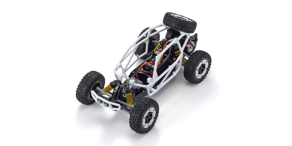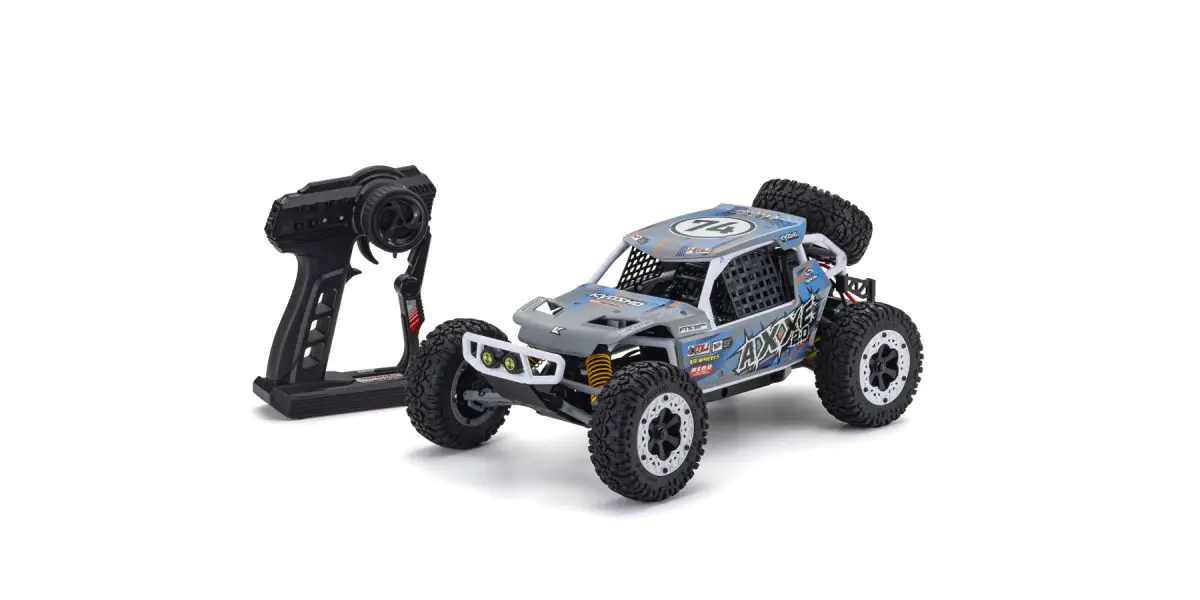 The simple design of Kyosho’s electric (EP) 1/10 scale EZ series buggy delivers the perfect combination of handling, high-performance, and affordability. Since its release in 2012, the EZ series AXXE has been a popular beginner R/C car and also a great second car for more experienced drivers. Following its excellent basic design, the new AXXE 2.0 has been reborn with upgrades to its standard R/C system components and a modified body for compatibility with modern day power sources. Like its sister model the Sandmaster which was renewed in 2023, the AXXE 2.0 has undergone some changes to its chassis design to accommodate various battery types and to reduce contact of the new gearbox with the road surface. The steering servo has also been upgraded to a 6kg high-torque specification that can handle heavy offroad driving loads and the waterproof speed controller (ESC) lets you charge through puddles without a worry. With a new body color scheme, the pipe frame used in real buggy rallies and races combines white pipes with chic gray panels and new decal designs. Choose from two different AXXE 2.0 body color patterns! Sold as a Readyset including body and pre-assembled chassis with R/C system installed, all you need to enjoy R/C car action is a battery for the car, battery charger, and batteries for the transmitter. The simple design structure is easy to disassemble and reassemble, which is optimal for maintenance and tuning.