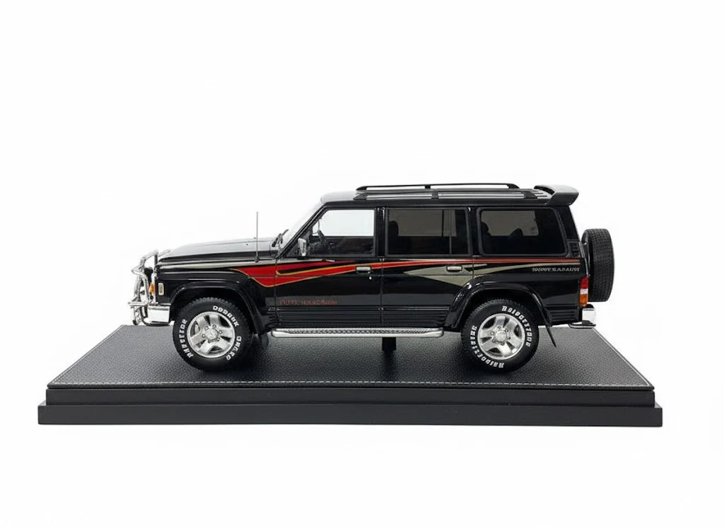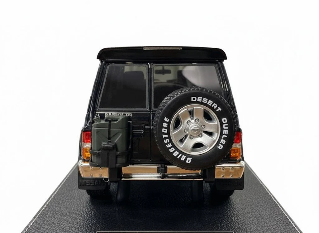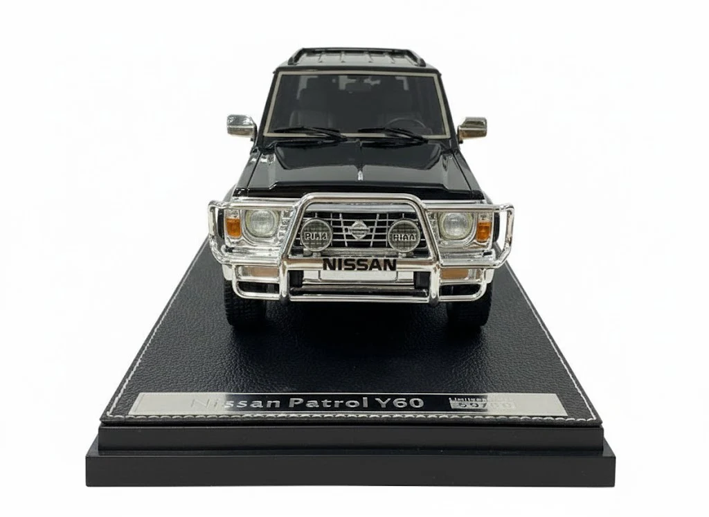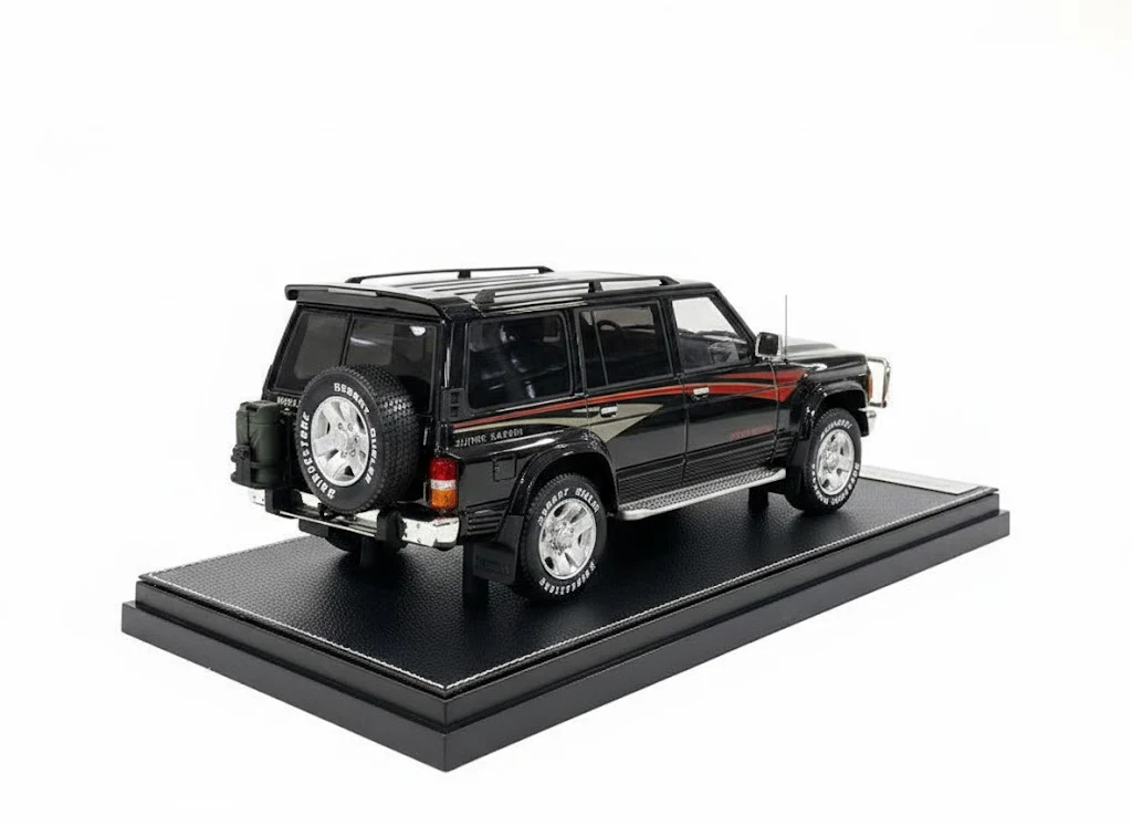 Finished in a deep black color, the Nissan Patrol Super Safari Y60 1:18 Ivy Merit highlights its strong and commanding off-road presence. The boxy body shape, high ground clearance, and classic SUV proportions are carefully recreated to reflect the real vehicle’s legendary reputation in extreme terrain and desert environments.